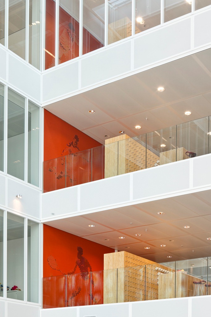 Terwijl op de kantoorvloeren van het nieuwe Europese hoofdkantoor van ASICS het functionele gebruik van de producten kleur brengt in het lichte, sobere, wit met grijze interieur, zit de warmte in het hart van het gebouw: oranje wanden met dynamische graphics en veelkleurige tapijten.